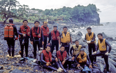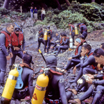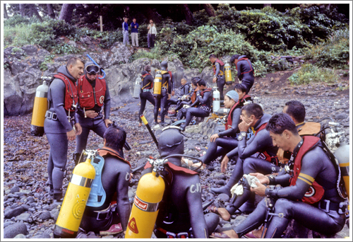 第1回のインストラクター・コースですが、当時はまだ、BC(スタビ等浮力調整ベスト)は普及しておらず、全員救命胴衣(炭酸ガスのカートリッジで膨らます)を着用して望むコースでした。また現在の様なイブ・コンピューターはやっとサンプルが輸入された程度で、一般のダイバーには殆ど使われていませんでした。潜水深度と潜水時間は「米海軍の標準減圧表」を順守しました。