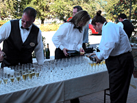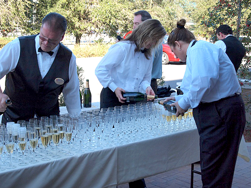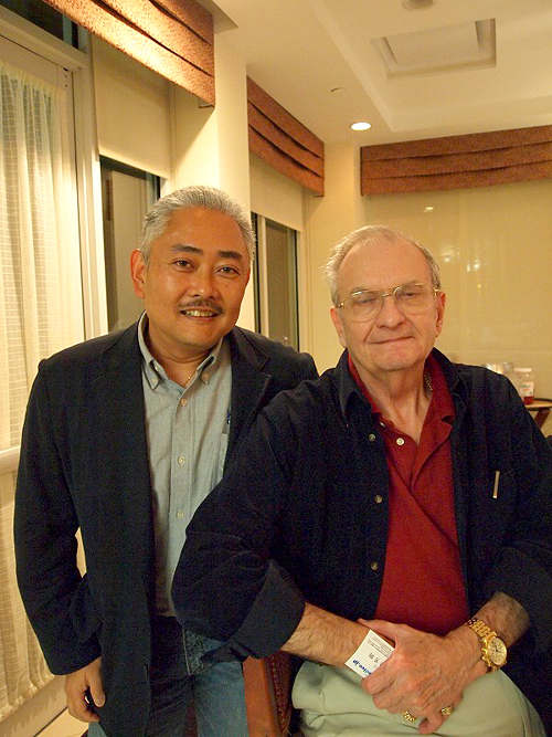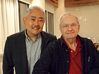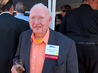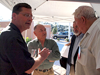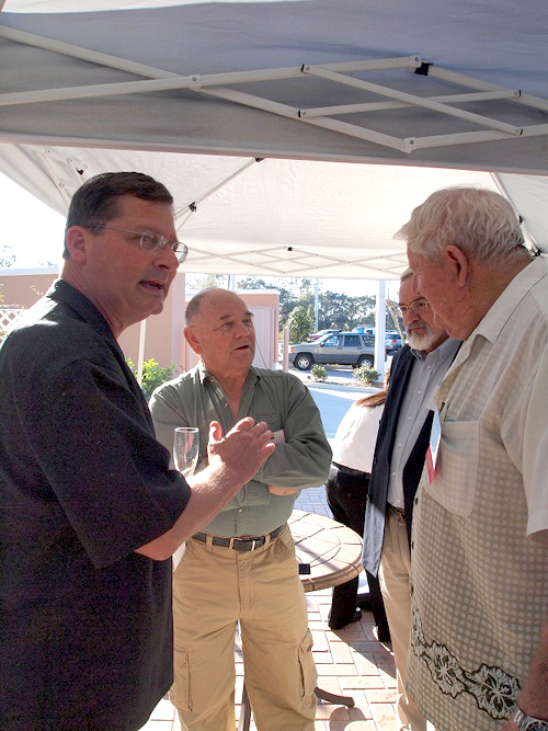 続いて「NAUI50周年」と「NAUI新社屋完成」を参加者全員、シャンパンで乾杯しました(写真3)。シャンパンを片手に、久しぶりに会う人などとそれぞれ雑談をしています。私もいろいろな人から声をかけてもらったり、ご紹介していただいたりしました。日本にNAUIを導入した功労者田口哲氏が、アメリカ滞在時にお世話になった方や(写真4:ホーマーフレッチャー氏)、日本で開催された初期のITCにスタッフとしてかかわった方(写真5:アーサーオーリック氏、写真6:ケンブロック氏)から当時の話を聞くことができました(50周年記念記事第1回目にホーマーフレッチャー氏とアーサーオーリック氏の当時の写真が掲載されています)。
