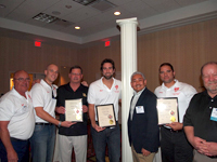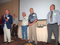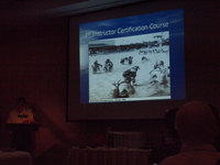 午後6時からNAUI50周年パーティの開始(写真11)です。アメリカのパーティらしく特段の挨拶もなくスタートしました。途中で第1回NAUI ITCの様子をスライドで映し出し、今回の主賓でもある第1回ITC参加者の表彰セレモニーがありました(写真12~14)。第1回ITC参加者の中にはダイビングに現在も携わっている方もいて、NAUIメンバーのたくましさを感じさせられました。1958年に第1回が放映されたアメリカのTVドラマ「シーハント」にもNAUIの初期のメンバーが出演したり、アドバイススタッフとしても参加したりしていたということで、「シーハント」の一部がスクリーンに映されると会場にいた年配のメンバーは大喜びをしていました。