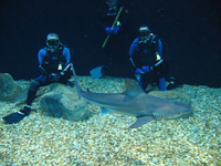 50周年イベントの翌日は、NAUI WWがスポンサーとなり、また、ダイバートレーニングも担当している、フロリダ水族館と、エプコット(ディズニーワールド)のリビングシーを見学してきました。タンパ水族館では水槽でサメと潜ることができ(写真16)、リビングシーでは巨大水槽でダイビングを楽しむことができます。そのいずれもダイバーをサポートしているのはNAUIメンバーです。ディズニーでダイビングを行うと、「ディズニーNAUIカード(経験カード)」を取得することができます。