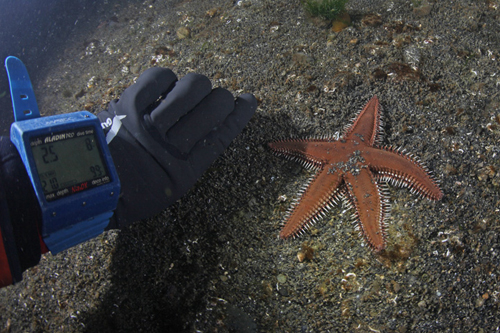 このトゲモミジガイというヒトデにはテトロドトキシンがあり、このヒトデを食べたボウシュウボラを更に採取した人が食べて食中毒事件が当地・清水で起きました。ならば、そのトゲモミジガイは、どのような過程で毒化していったのかを探るのが本研究です。フグと同じような行程で毒化してゆくとしたら、必ず毒化原因餌生物がいるわけで、その特定と索餌行動を分析して真相の解明を試みております。行動や水深・環境が特定できると、ファクターの絞り込みができ、今後の研究の方向性をより明確にすることができます。この研究の成果によって、他のテトロドトキシンをもつ生物の毒化メカニズムの指標が構築され、今後海洋生物による食中毒被害を減少方向へと導くことができるのでは?と考えております。