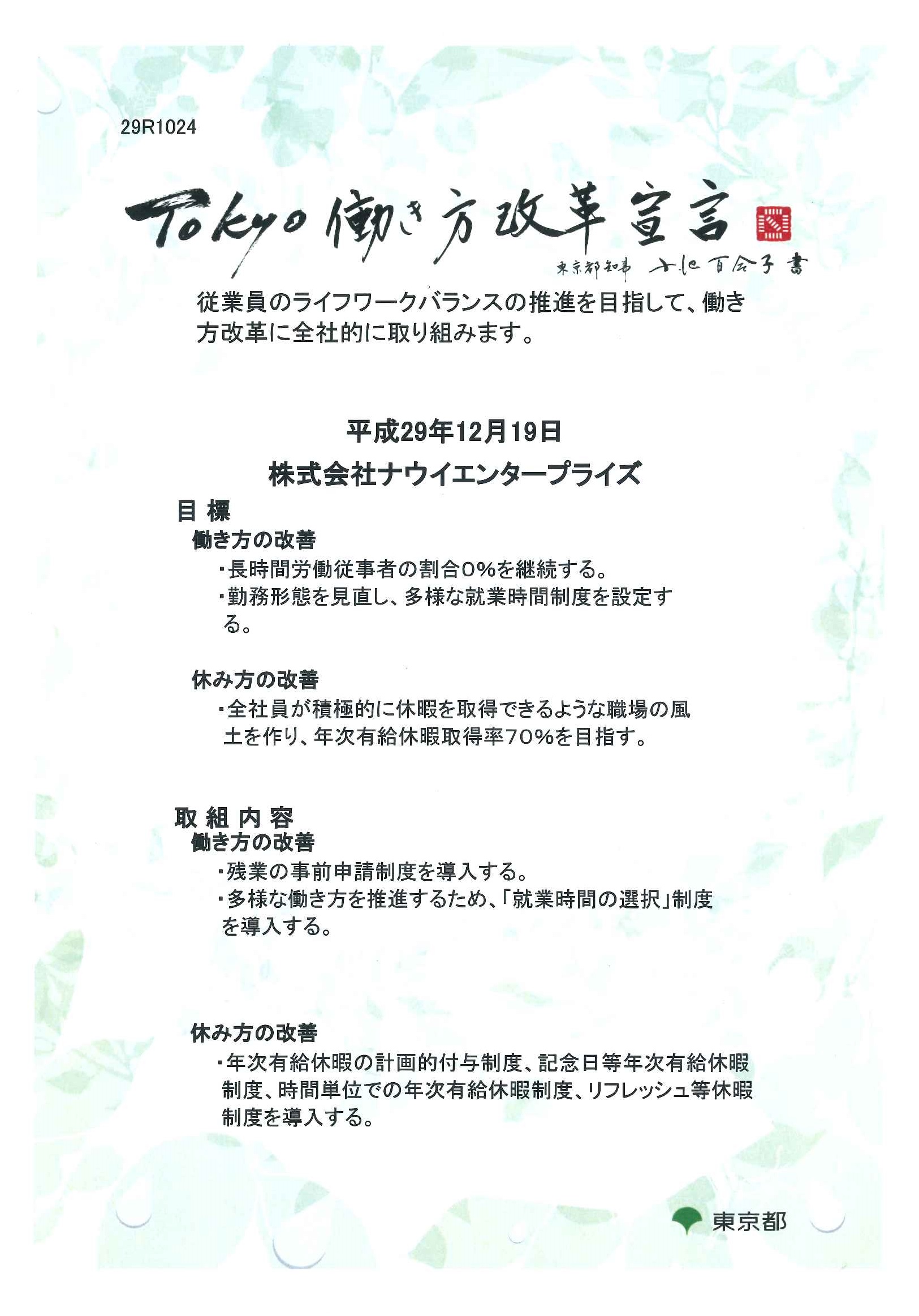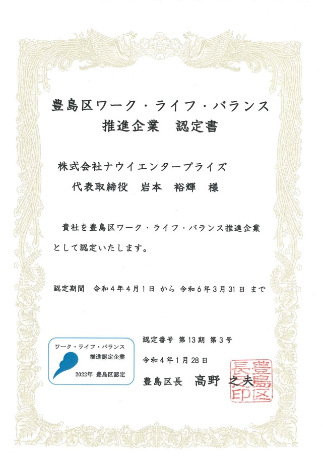 豊島区では、従業員の仕事と生活の調和(ワーク・ライフ・バランス)を推進し、仕事と生活が調和し充実した暮らしを実現することにより、従業員の社会生活と家庭生活を両立できるよう職場環境づくりをしている企業等を、「豊島区ワーク・ライフ・バランス推進企業」として認定しており、当社も認定を受けました。今後も従業員が働きやすい環境を目指し、キャリアアップを目指す方、仕事と家庭との両立を目指す方など、多様なスタイルに対応できる企業でありたいと考えています。