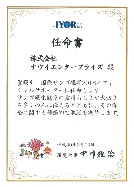 環境省より「国際サンゴ礁年2018オフィシャルサポーター」として任命を受けました。