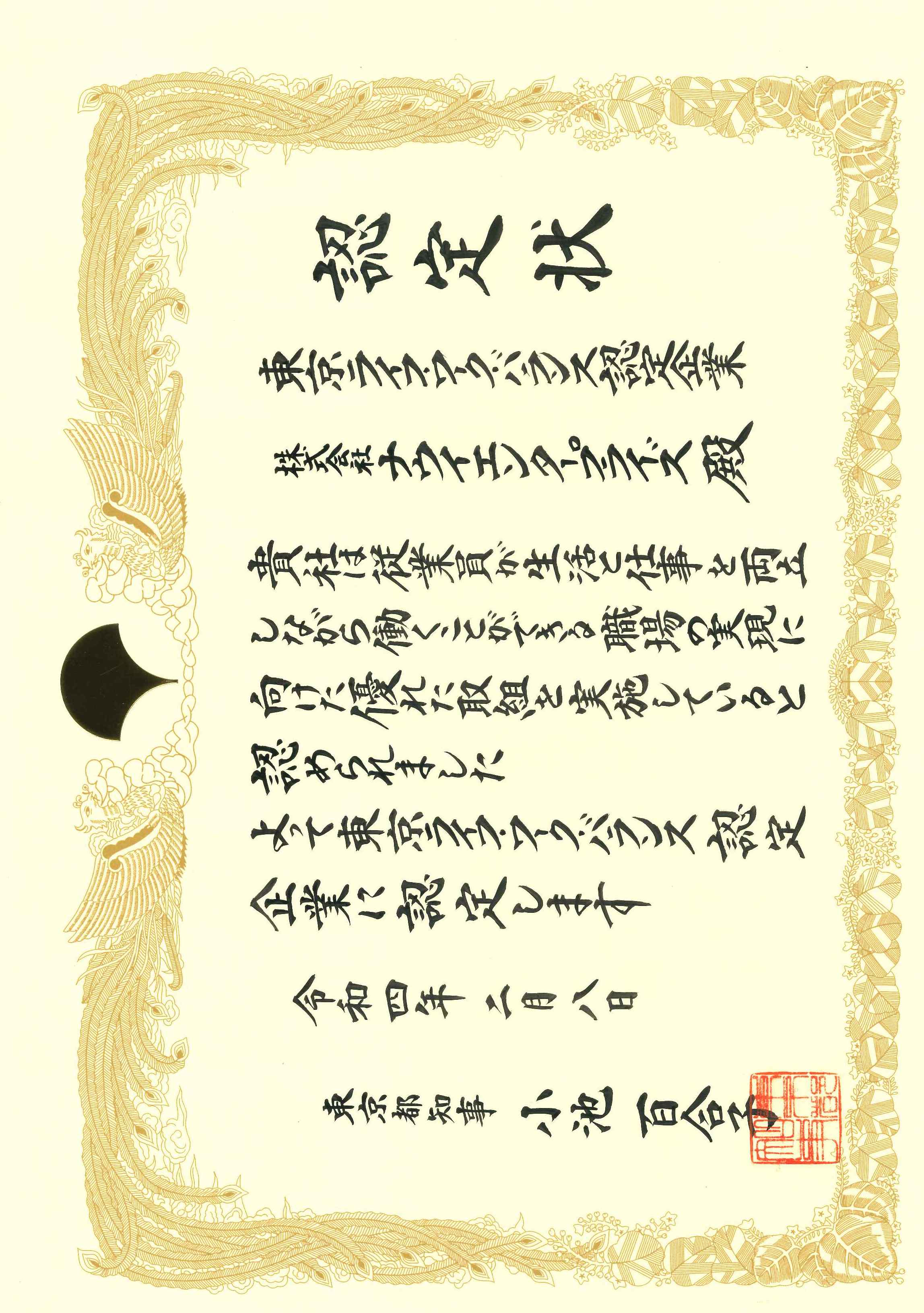 生活と仕事の調和の実現に向け、優れた取り組みを実施している中小企業等を、東京都が「東京ライフ・ワーク・バランス認定企業」として認定しています。