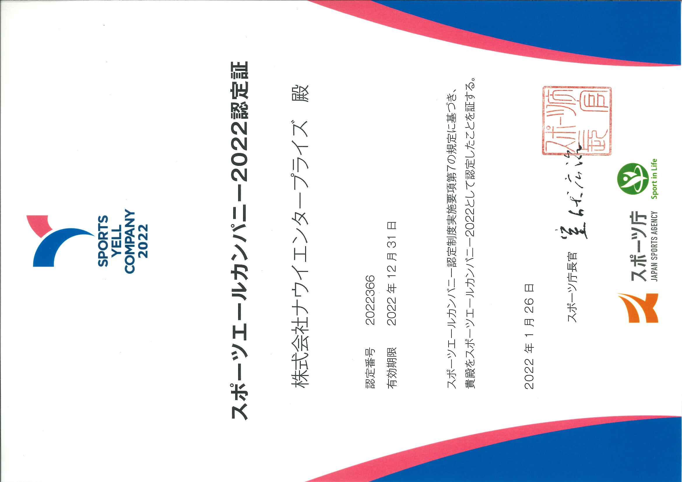 従業員の健康増進のためにスポーツ活動の促進に積極的に取り組む企業として、スポーツ庁から「スポーツエールカンパニー」として認定されました。