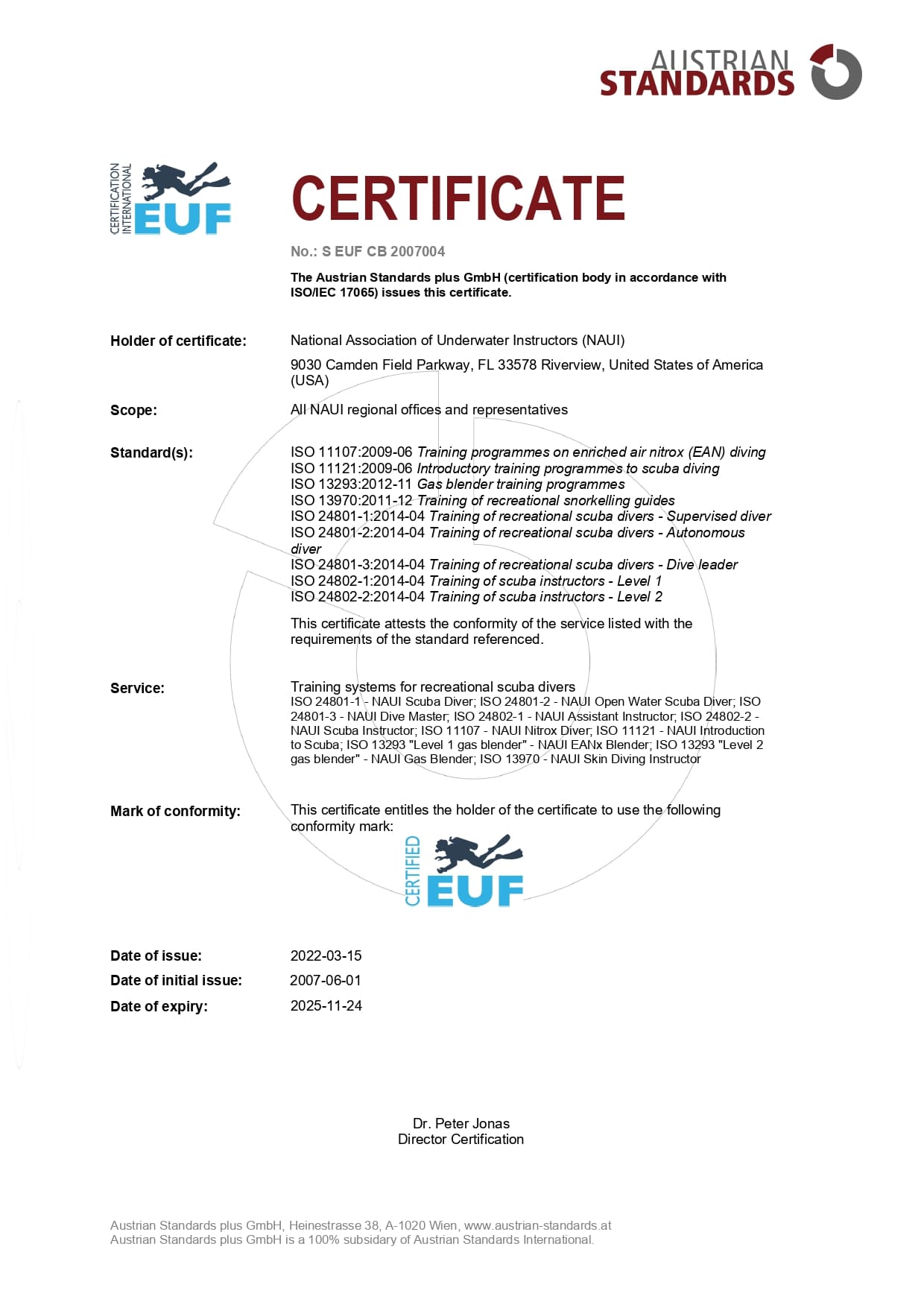 NAUIトレーニングシステムは、 ISO (国際標準化機構) ダイビング基準に定められた要件を満たし、全ての基準においてその規格を上回っているという認証を受けています。