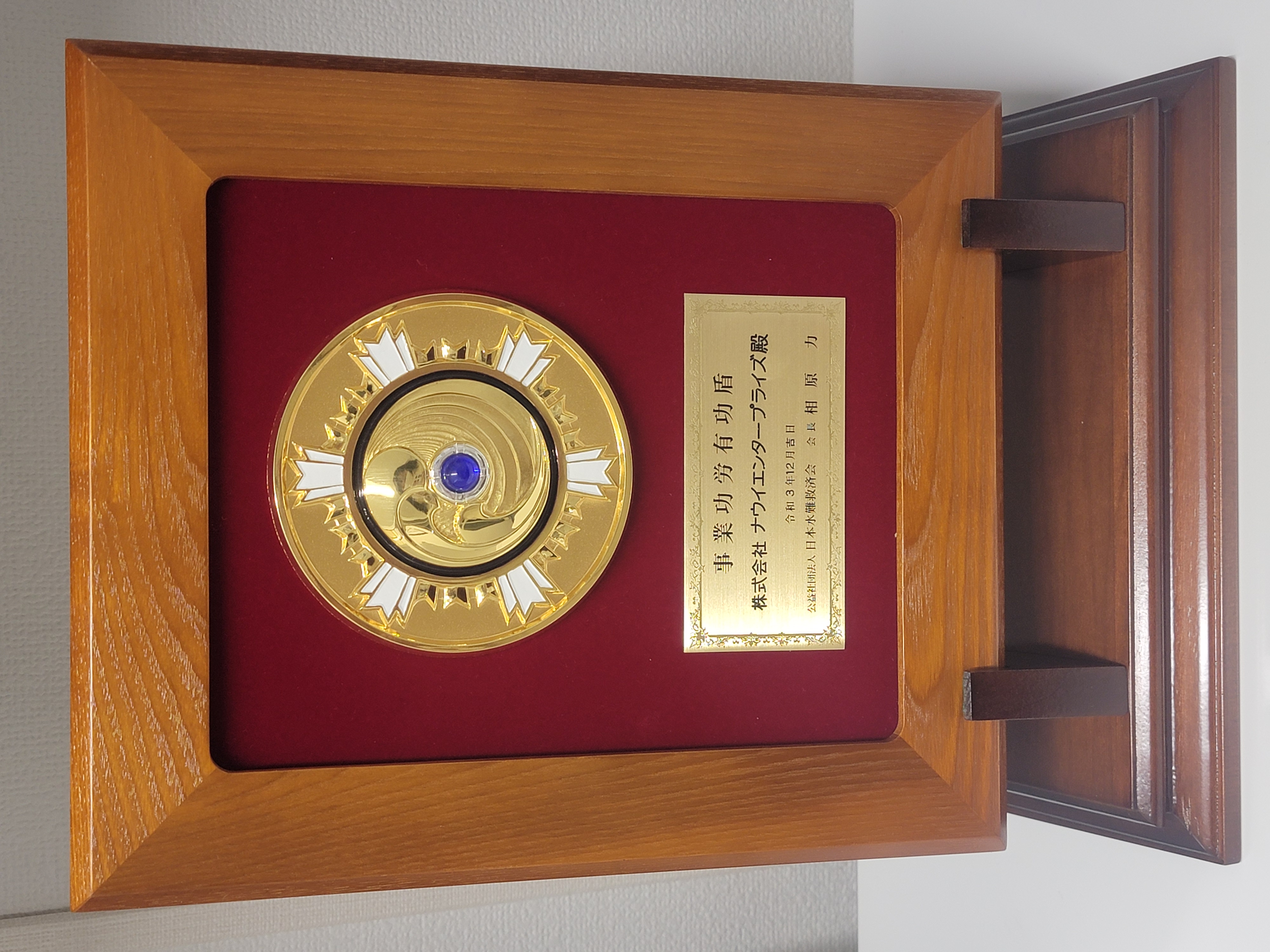 2021年12月に弊社にて、公益社団法人日本水難救済会の事業への功労に対し、業務執行理事(常務理事)遠山 純司氏より、感謝状および事業功労有功盾を授与されました。