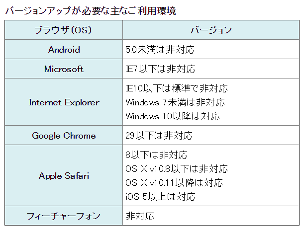 上記の理由により、大変申し訳ございませんが、2018年10月31日までに「TLS1.2」に対応するOS・ブラウザにバージョンアップをお願いいたします。