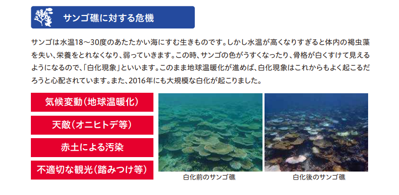 ダイバーのフィールドである海の中において、色鮮やかで綺麗なサンゴ礁でダイビングをすることは楽しみのひとつでもあります。そして、最も多くの生物が集まり、生物多様性に富む生態系であるそのサンゴ礁が年々深刻な危機に直面しています。