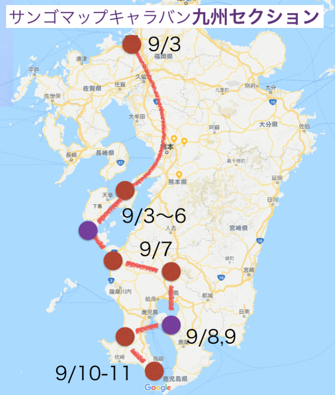 9月3日福岡から始まり九州セクションが11日間、そのあと奄美・沖縄セクションが11日、合計22日間のツアーです! サンゴ情報の少ない場所の調査とサンゴマップの普及の旅です。