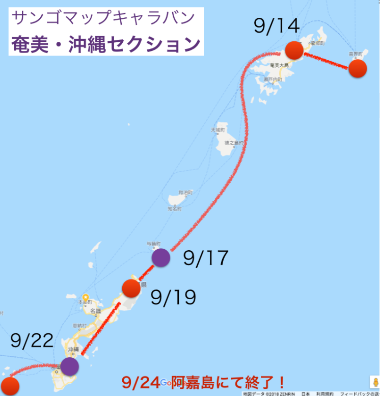 調査は9月3日福岡から9月24日沖縄県阿嘉島までの22日間です。